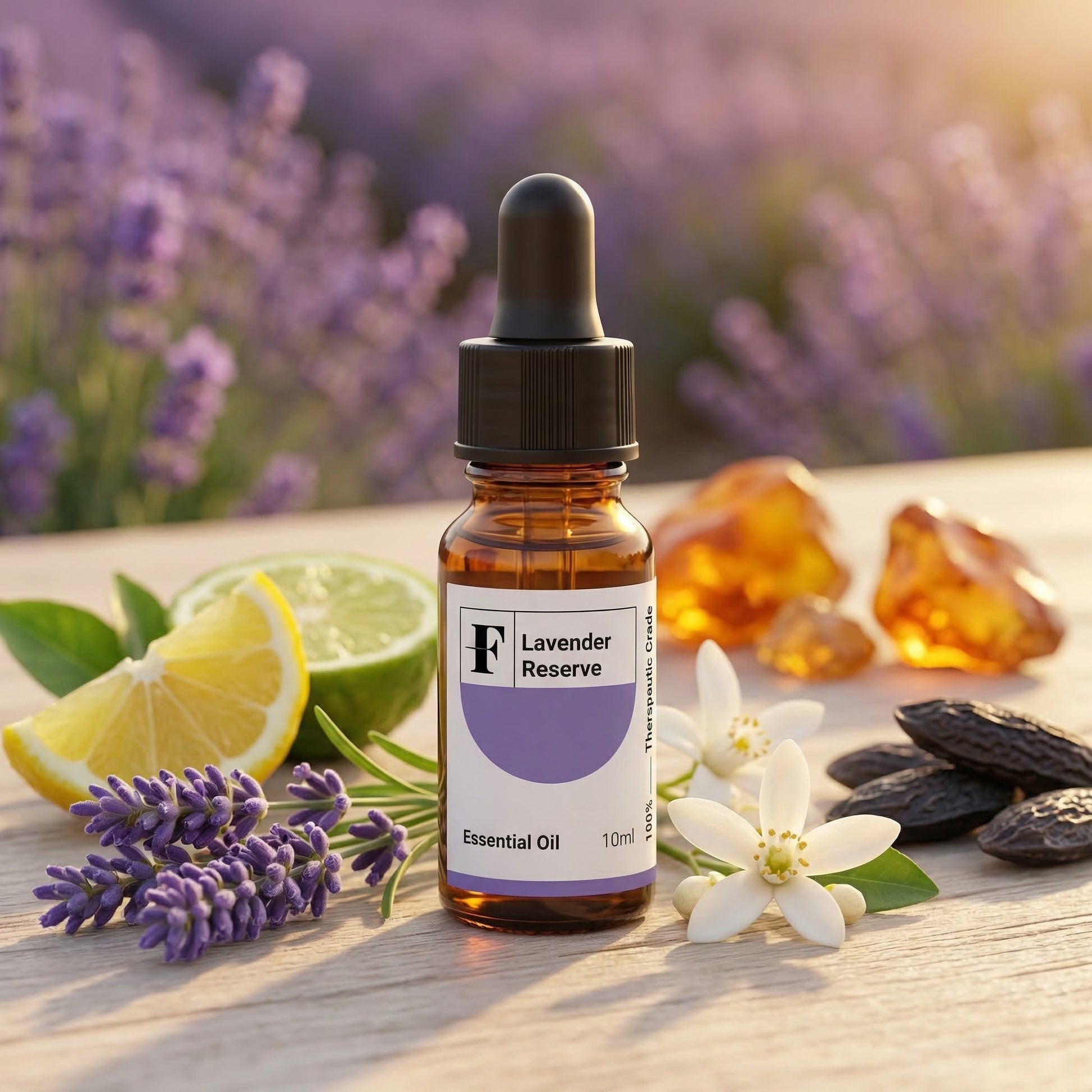 Lavender Reserve is a refined essential oil blend that brings together calming lavender with bright citrus and warm amber undertones for a truly elegant aromatic experience.