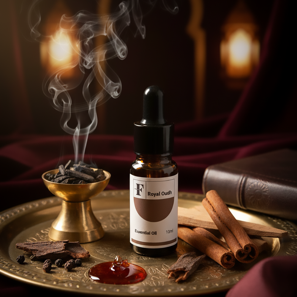 Royal Oudh Essential Oil is a rich, sacred blend crafted from luxurious saffron threads, warm nutmeg, precious agarwood (oudh), Indian rosewood, and golden amber balsam.